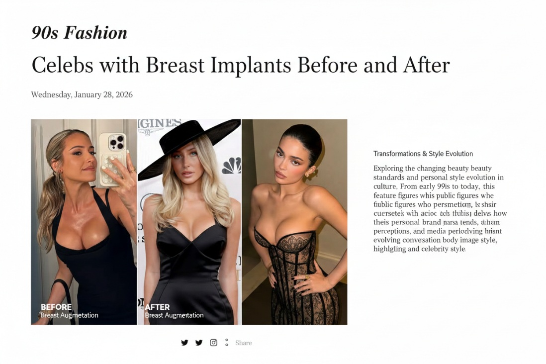 Celebrities are high-visibility examples of aesthetic change: their images are widely published, they have teams (stylists, makeup artists, lighting, photographers), and their transformations get public attention. People search “celebs with breast implants before and after” to: